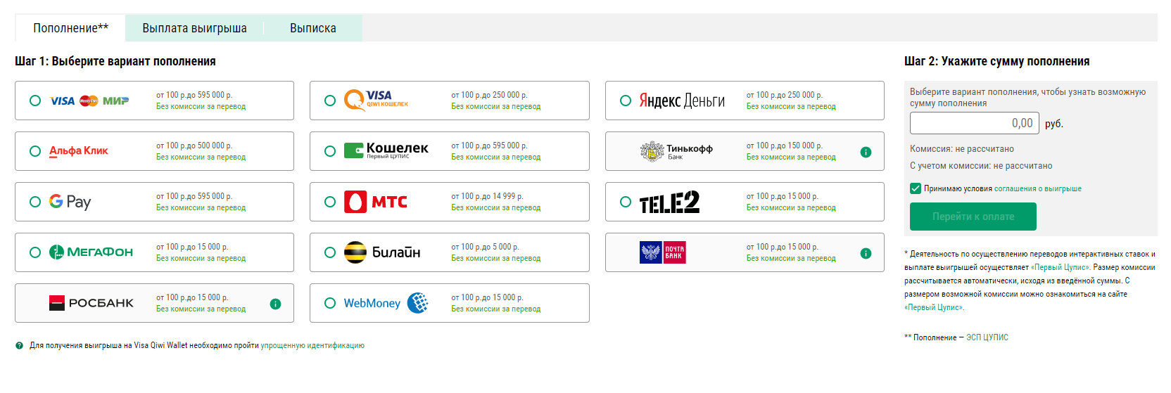 Максимальная сумма вывода для карт, банковского перевода и «Кошелька ЦУПИС» — 550 тыс. рублей, для Qiwi Visa Wallet и «Яндекс.Денег» — 15 тыс. рублей.