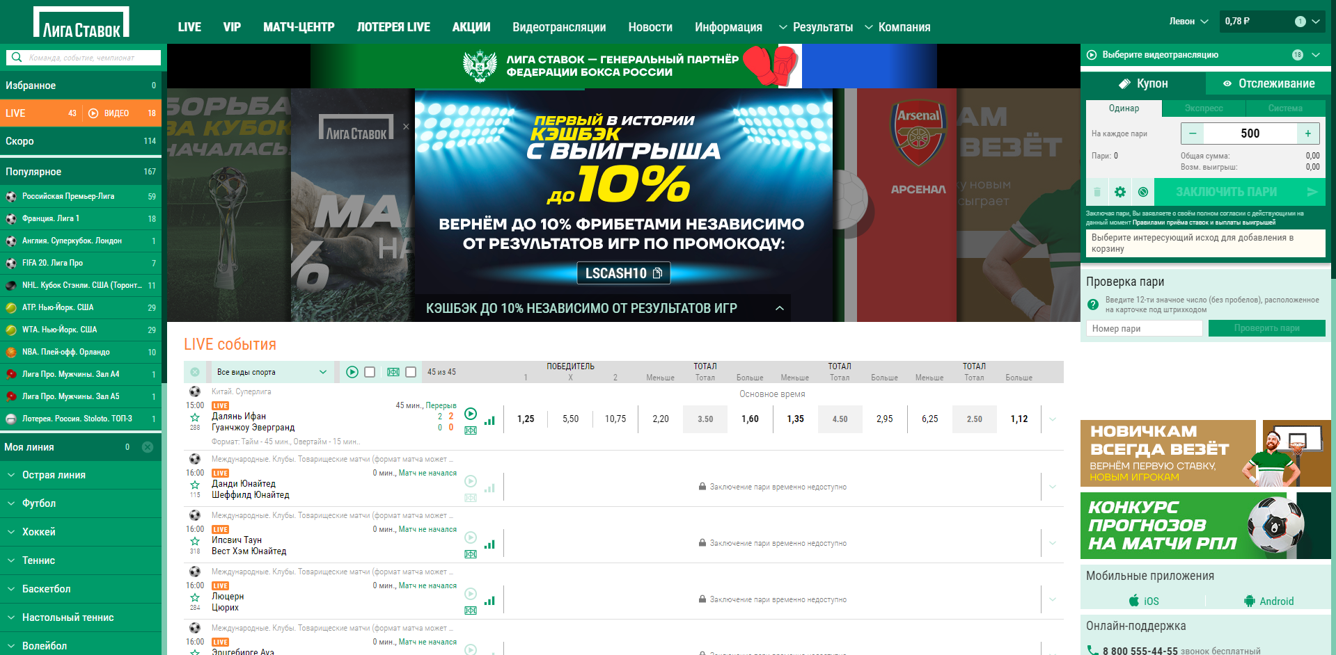 В линии представлены 20 видов спорта, а также специальные ставки – на тренерские назначения, политические события, на шоу-бизнес и другие. Выбор соревнований разнообразен. В футбольном разделе вы найдете матчи не только высших лиг – представлены турниры в более чем 65 странах и крупные международные первенства.