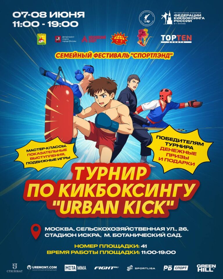 На площадке Федерации кикбоксинга России каждый день с 11:00 до 18:00 часов будут проходить показательные выступления, мастер-классы с чемпионами, подвижные игры и турнир «URBAN KICK» на силу удара рукой и ногой, в котором сможет принять участие каждый. Уровень спортивной подготовки не имеет значения. Победители будут определяться в четырёх возрастных категориях и получат денежный приз. Призёрам будут вручены дипломы и подарки от партнёров. С условиями участия вы можете ознакомиться в социальных сетях ФКР. Регистрация по ссылке.