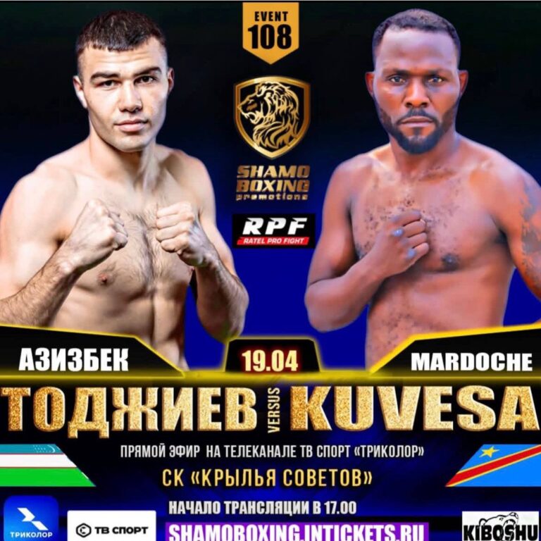 Перспективный узбекский средневес Азизбек Тоджиев (8-2, 4 КО) проведёт бой 19 апреля в Москве на совместном вечере от промоутерских компаний Shamo Boxing Promotions и Ratel Pro Fight, который пройдёт на арене УСК «Крылья Советов». Соперником узбекского боксёра станет конголезец Мардочи Кувеса Катембо (17-9-1, 2 КО).