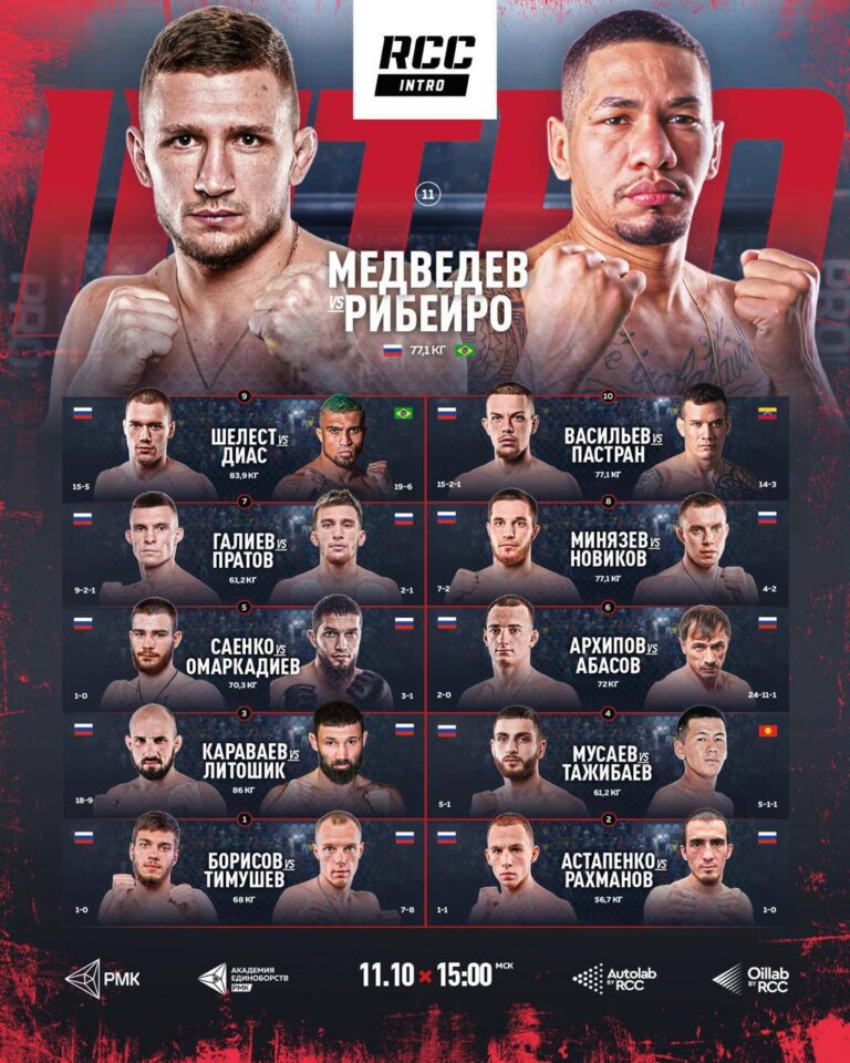Завтра в Екатеринбурге на арене Академии единоборств РМК состоится турнир RCC Intro 37, который возглавит бой Бориса Медведева и Александре Рибейро. В прямом эфире турнир покажет телеканал UDAR.