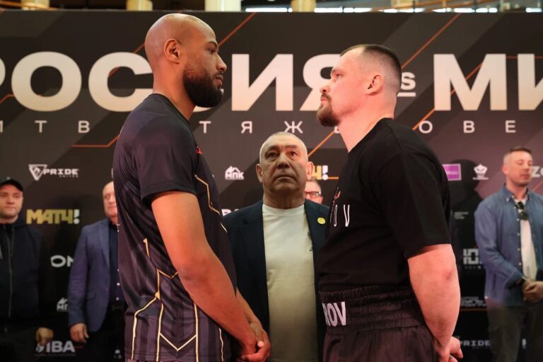 Всего в рамках противостояния сборных России и мира пройдут пять четырёхраундовых боёв в тяжёлой весовой категории. Полные результаты взвешивания: